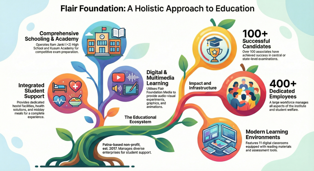 General Introduction ~ ‘Flair Foundation’ is a not-for-profit organisation headquartered in Patna, Bihar. reg. charity no BR/2020/0255875 is a group of several enterprises that are related to the field of education. Its most famous enterprise is the institution named ‘Ram Janki (+2) High School’ which provides guidance to students preparing for board exams through six branches in two major districts of Bihar, Patna and Vaishali. ‘Kusum Academy’ is its second major enterprise, through which preparation of complete competitive examinations through Hindi and English mediums is done through high quality mediums. ‘Flair Foundation Media’ is one of its emerging platforms, through which new educational experiments are being done in audio-visual format for the preparation of various board exams and competitive exams. ‘Flair Foundation Hostel’ is another big emerging platform of this, through it providing separate physical hostel facilities for boys & girls in various CBSE affiliated schools.